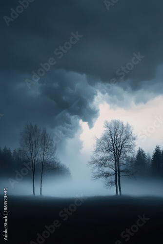 © AIPhoto, Fototapeta premium Dramatic Storm Clouds Over Misty Forest with Bare Trees in Foreground