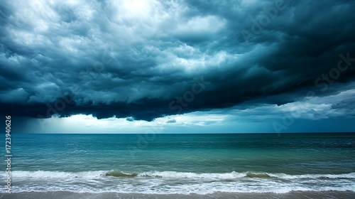 Fototapeta premium Dramatic stormy ocean waves under dark ominous clouds powerful nature...