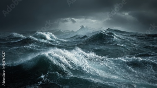 Fototapeta premium Dramatic stormy ocean with massive crashing waves and dark turbulent clouds