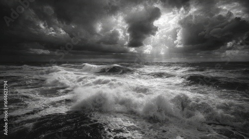 Obraz premium Dramatic stormy seas, sun breaking through dark clouds