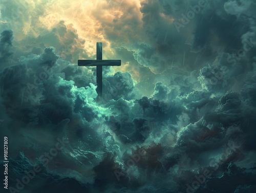 Naklejka premium Dramatic Stormy Skies with Powerful Christian Cross Symbol Concept