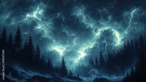 © julio, Obraz premium Dramatic stormy sky over a dark forest landscape.