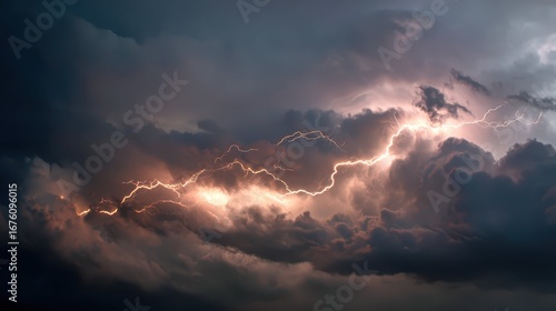 © Kitta Studio, Obraz premium Dramatic Stormy Sky with Cracked Lightning Patterns at Dusk