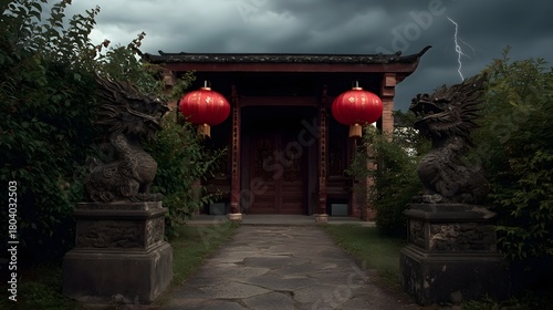 © Bussakon, Obraz premium Dramatic stormy sky with lightning over a traditional Chinese temple entrance guarded by stone dragons and illuminated by red lanterns