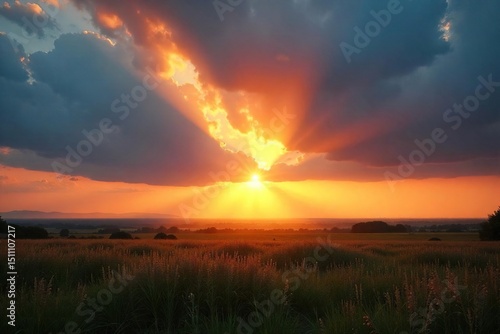 © Wanchai, Fototapeta premium Dramatic sun rays burst through a break in dark clouds, illuminating a landscape in brilliant light Golden hour, strong backlighting, ethereal, powerful nature scene , nature, weather, bright