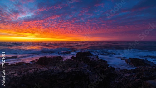 Fototapeta premium Dramatic sunrise over a rugged shoreline with vibrant hues of orange and...