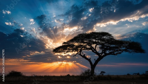 Fototapeta premium Dramatic sunrise over African savanna with acacia tree