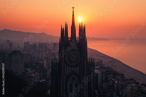 © ika, Fototapeta premium Dramatic sunrise over gothic church and cityscape.