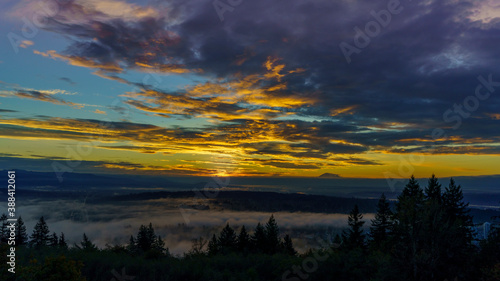 © Andrew, Fototapeta premium Dramatic sunrise over mist-covered Fraser Valley, BC - Autumn