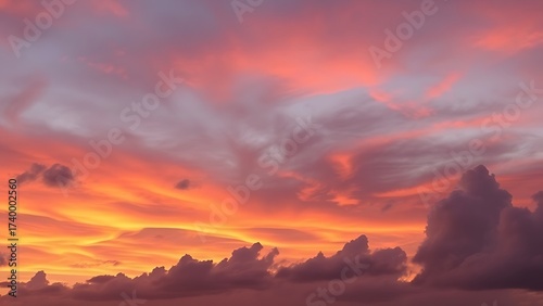 Fototapeta premium Dramatic sunrise with gradient orange and purple clouds, creating a panoramic abstract sky view.