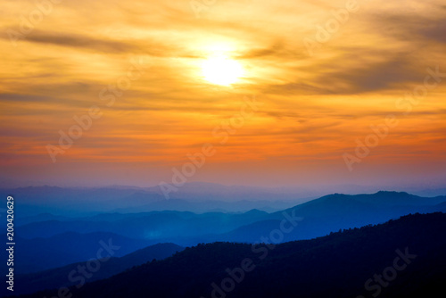 Fototapeta premium Dramatic sunset and sunrise sky and clouds over blue mountains layers