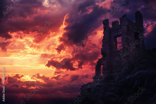 Fototapeta premium Dramatic Sunset Behind Ancient Ruins on a Hilltop