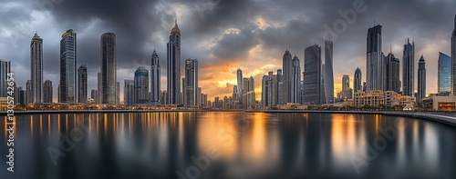 © BerkahStock, Fototapeta premium Dramatic sunset cityscape reflected in calm waters; modern skyscrapers.