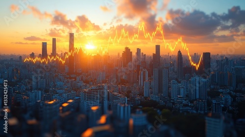 © Art Sof galery photo, Obraz premium Dramatic sunset cityscape with superimposed stock market graph showing upward and downward trends.