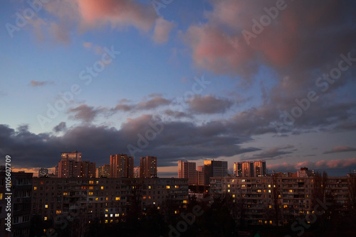 © Ryzhkov Oleksandr, Fototapeta premium Dramatic Sunset Clouds Over City Skyline