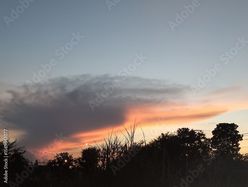 © MANASNAND, Fototapeta premium Dramatic Sunset Cloudscape with Flaming Orange Streaks and Silhouetted Trees