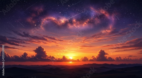 © ryandi, Obraz premium Dramatic sunset featuring celestial cloudscape with shooting stars