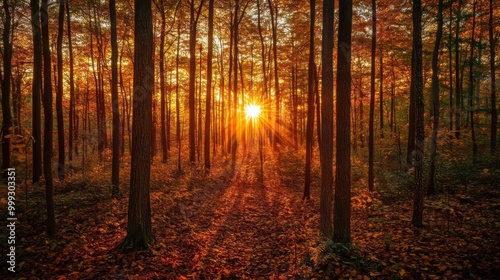 Obraz premium dramatic sunset filtering through a dense forest of autumn trees