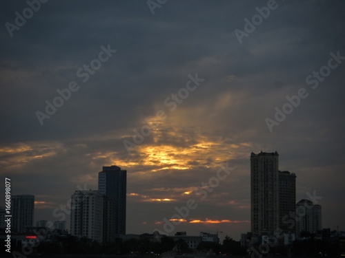 Fototapeta premium Dramatic Sunset Glow Over Downtown Skyline, Low-Light Cityscape on West Lake in Hanoi, Vietnam
