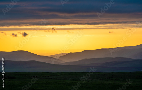 Obraz premium Dramatic sunset in Aksu Zhabagly Reserve. Fairytale evening dark panorama...