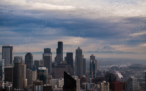 © Nathaniel Gonzales, Fototapeta premium dramatic sunset in Seattle skyline with Mt. Rainier on the background.