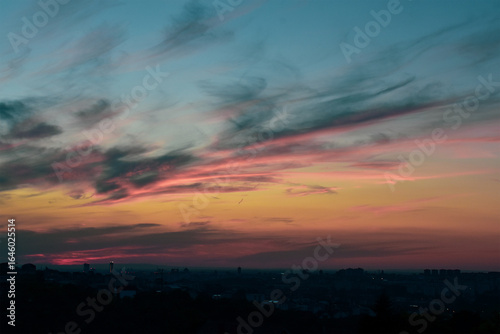 Fototapeta premium Dramatic sunset lights up the city's horizon