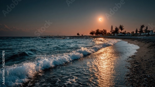 Fototapeta premium Dramatic sunset over a beach, waves crashing