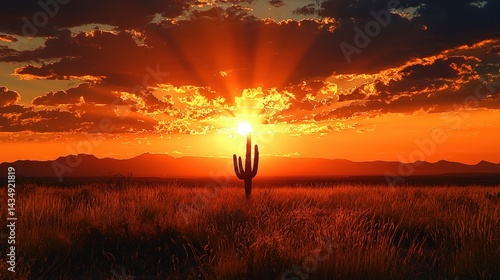 Fototapeta premium Dramatic sunset over a desert landscape with a solitary cactus.