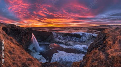 © afif, Fototapeta premium Dramatic sunset over a frozen waterfall in Iceland.