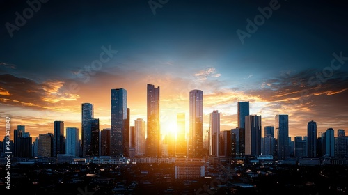 © Vangly, Fototapeta premium Dramatic sunset over a modern city skyline, showcasing towering skyscrapers and vibrant colors.