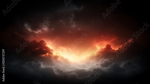 Fototapeta premium Dramatic sunset over a mystical landscape with vibrant clouds and twinkling...