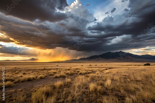 Obraz premium Dramatic Sunset Over a Vast Desert Landscape with Mountains and Storm Clouds