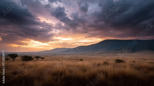 © Thares2020, Obraz premium Dramatic sunset over a vast savanna landscape with distant mountains and stormy clouds