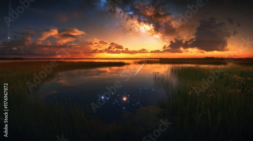 © Alfath, Obraz premium Dramatic sunset over calm lake with starry sky reflection.