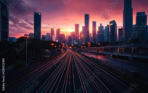 © Stanislau, Fototapeta premium Dramatic sunset over city skyline with railway tracks in the foreground