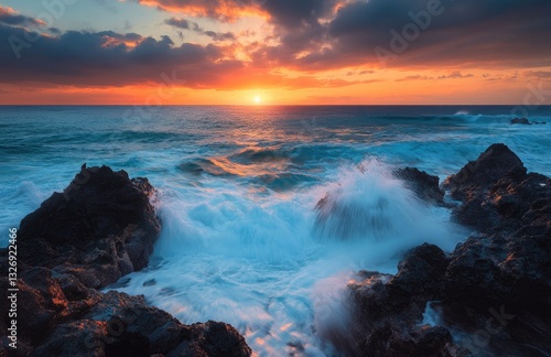 © AT, Fototapeta premium Dramatic sunset over crashing waves on volcanic rocks