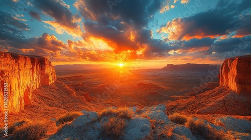 Fototapeta premium Dramatic Sunset Over Desert Canyon with Fiery Clouds and Golden