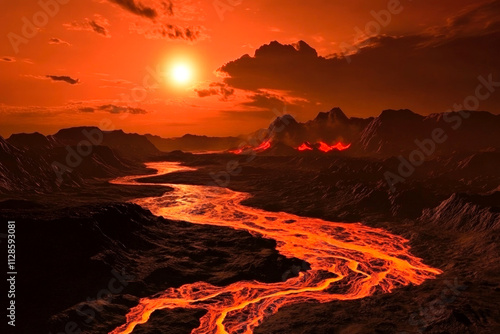 Fototapeta premium Dramatic sunset over flowing lava river in volcanic landscape
