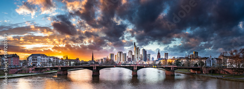 Fototapeta premium Dramatic Sunset over Frankfurt am Main, Germany Skyline with Stone Bridge