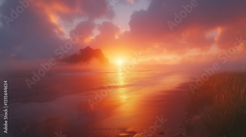© Lemdah, Fototapeta premium Dramatic Sunset over Misty Beach