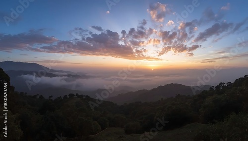 © MDLATIFUR, Obraz premium Dramatic sunset over misty mountains with vibrant clouds