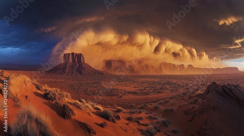 Fototapeta premium Dramatic sunset over Monument Valley with a massive dust storm approaching.