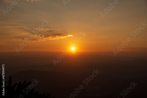 Fototapeta premium Dramatic sunset over mountain landscape. Beautiful landscape foggy hills...