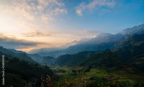 Obraz premium Dramatic sunset over mountain landscape. Beautiful landscape foggy hills twilight time. Blue golden sky sunrise dramatic beautiful landscape mountain. Dawn sky gold dusk time cloudscape with sunlight