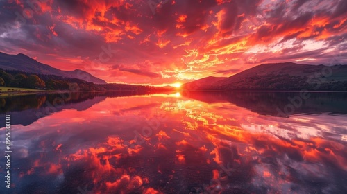 Obraz premium Dramatic Sunset Over Mountains Reflected in a Lake.