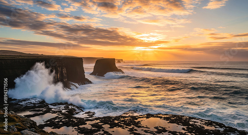 Obraz premium Dramatic sunset over ocean waves crashing against rugged cliffs.