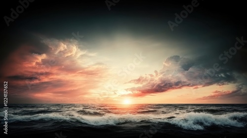 © JES Visions, Obraz premium Dramatic Sunset Over Ocean Waves with Colorful Cloudy Sky and Gentle Sea Breeze