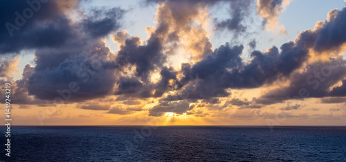 © edb3_16, Fototapeta premium Dramatic Sunset Over Ocean with Luminous Clouds and Golden Sky