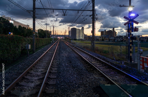 © Osaze, Fototapeta premium Dramatic sunset over rail tracks vanishing into point at station