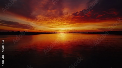 Naklejka premium Dramatic Sunset over River with Bridge